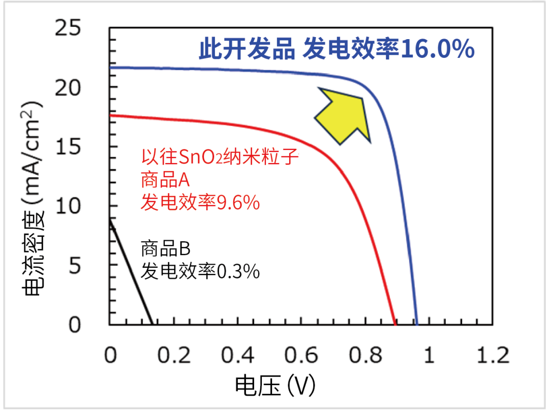 虽然涂布型工艺在非真空状态下的制造成本很有优势,但沉积油墨的溶剂会损坏钙钛矿发电层。在不造成损伤的有机溶剂中,存在纳米级(大约 10-9 m)的氧化锡 (SnO2) 会聚集,无法粘附在钙钛矿发电层上的课题。新开发的用于涂层电子传输层薄膜沉积的墨水,成功地将氧化锡纳米颗粒的表面分散在有机溶剂中,而不会通过用适当的材料涂覆表面而使其团聚。从而可以形成充分粘附在钙钛矿发电层上的致密涂层膜。这使得钙钛矿发电层产生的电子可以有效地传输到金属电极。 通过采用这项新技术,我们实现了 16.0% 的高发电效率,约为以往产品的 1.5 倍。